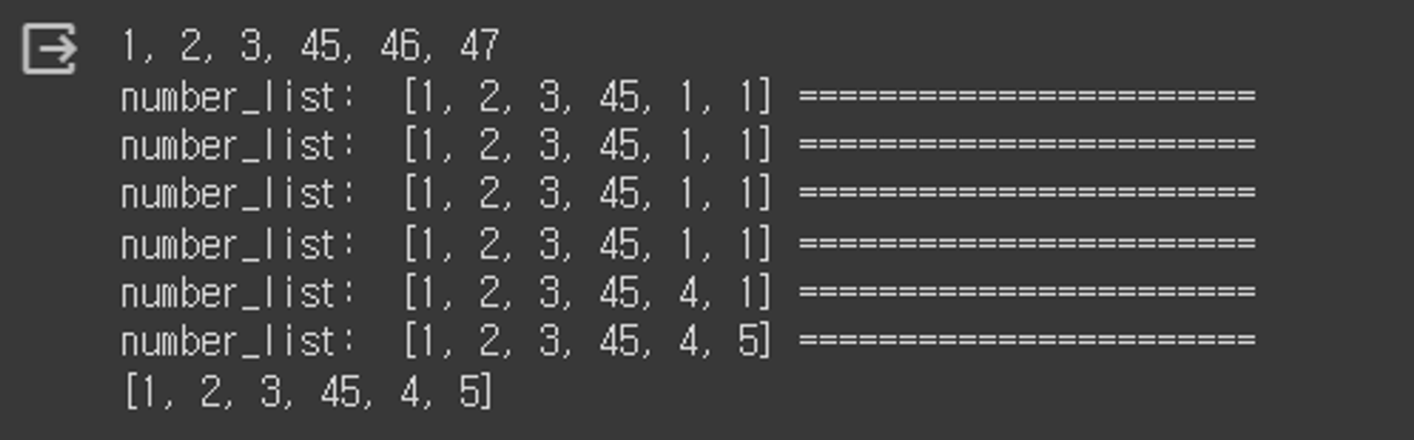 number_list = make_lotto_number(input_numbers) ## 처리가 다된 숫자 6개가 담긴 리스트를 전달받음.